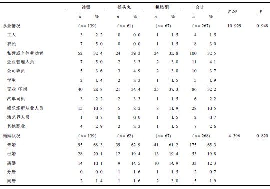 2.1 新型毒品 滥用者的人口学特征268例新型毒品 滥用者中以滥用冰毒 为主139 例( 51.9% ), 以滥用摇头丸 为主62例( 23.1% ) , 以滥用氯胺酮为主67 例( 25.0% )。被调查者的年龄29.2 a ! s 6.3 a, 其中最小的19 a,最大的50 a。以21- 30 a年龄段、女性、初中文化程度、汉族、私营/个体劳动者、无业和未婚者居多,三种新型毒品 滥用者的性别、年龄、文化程度、民族、从业情况及婚姻状况差异无显著性(P > 0.05),详见表1。